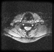 Axial magnetic resonance image of the cervical spine. This image reveals a C6-C7 herniated nucleus pulposus.