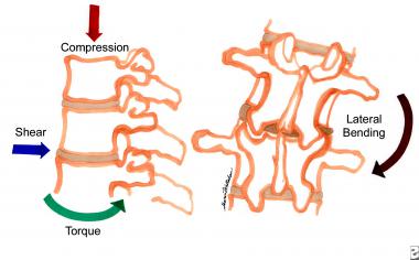 The spinal motions that frequently are encountered in many sports and other activities include flexion and extension, torsion (rotational forces), and lateral bending. Additionally, certain sports can subject the spine to shear forces in the anterior and posterior position, as well as to compressive forces in the craniocaudal direction. Protection of the functional units of the spine requires unrestricted and efficient motions between adjacent vertebral segments. Simple flexion/extension movements and even moderate axial compression forces are relatively well tolerated by the disc and the associated joint complexes of the spine.
